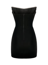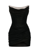 A black ruched mini dress with a shimmering crystal-trimmed neckline. A bold silhouette paired with refined sparkle for those who appreciate standout details.
