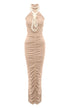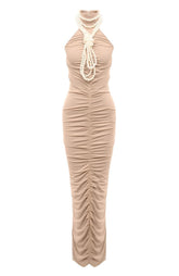 A sculptural nude-toned dress with delicate ruching that enhances the body’s natural curves. The pearl neck detail adds an aristocratic touch and vintage charm.