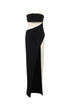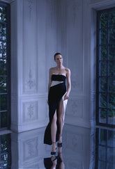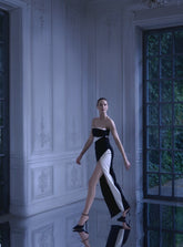 A bold black and white gown with dramatic draping and a daring slit. The architectural silhouette and contrasting palette strike a perfect balance between classic and avant-garde.