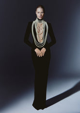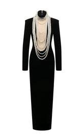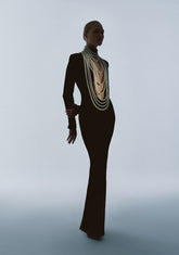 An exquisite gown with a plunging neckline and layers of pearl detailing, embodying sophistication and the power of femininity. A modern take on timeless elegance.