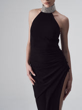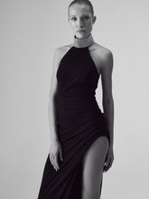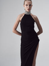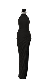 A minimal yet striking gown with a high embellished collar. Elegant draping and a bold slit accentuate the silhouette, adding refined sensuality to the look.