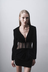 A modern mini dress with a plunging neckline and mesh corset insert creates a bold and confident look. A striking balance of structure and seduction.