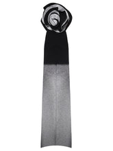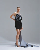 A magnificent gown featuring a silver-glazed rose and a flowing train that evoke drama and grandeur. A harmonious fusion of light, movement, and architectural artistry.