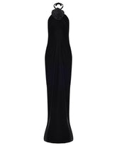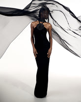 A full-length velvet gown adorned with a dramatic rose detail. The clean silhouette and rich texture evoke timeless evening elegance.